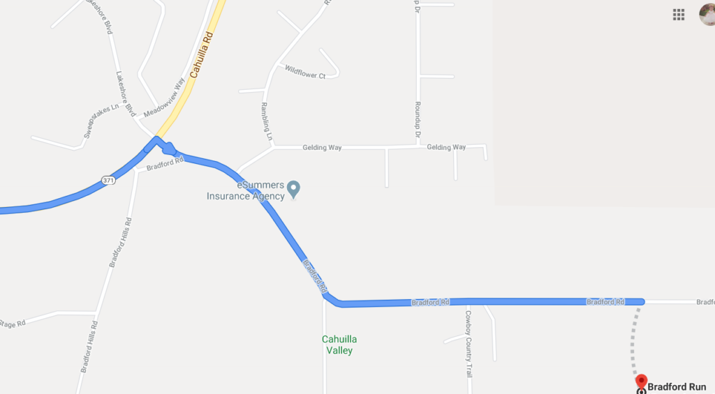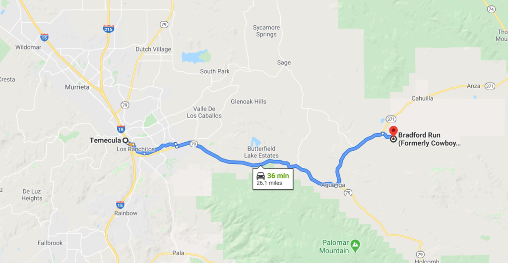 >From Temecula, CA Bradford Run is about 35 miles east off the 79 South Highway. Turn right onto Bradford Road and follow the road to the end.